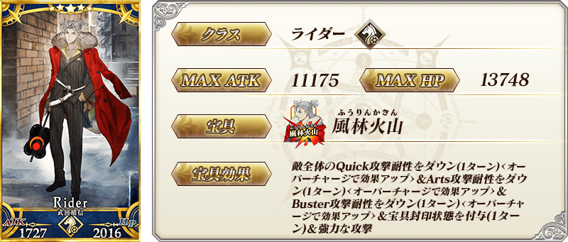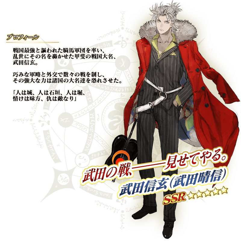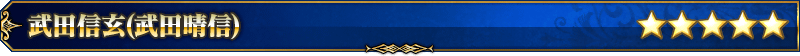 ※「★5(SSR)武田信玄(武田晴信)」は「★5(SSR)武田晴信」を霊基再臨第3段階にすることで名称が「★5(SSR)武田信玄」に変化します。
