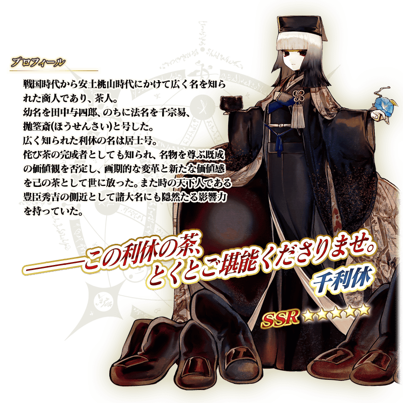 ※上記の「★5(SSR)千利休」のセイントグラフおよびイラストは霊基再臨第2段階のものです。
