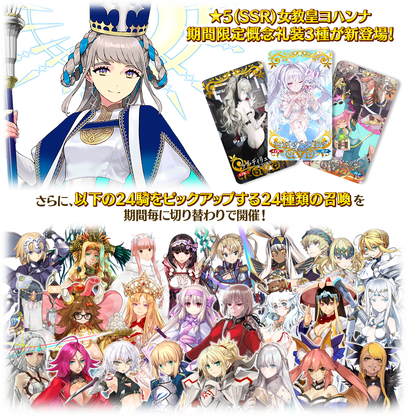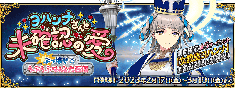 期間限定イベント「ヨハンナさんと未確認の愛 ぶっ壊せ☆らぶらぶはぁと大石像」の開幕を記念して、新登場の期間限定サーヴァント「★5(SSR)女教皇ヨハンナ」と、期間限定概念礼装3種をピックアップ!