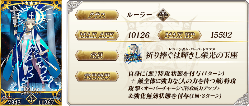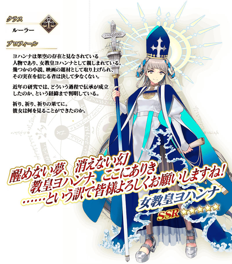 ※上記の「★5(SSR)女教皇ヨハンナ」のセイントグラフおよびイラストは霊基再臨第3段階のものです。
