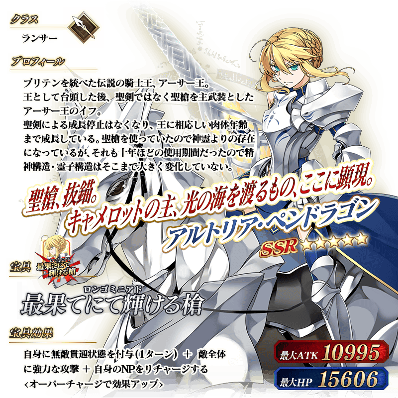 ※上記の「★5(SSR)アルトリア・ペンドラゴン(ランサー)」のイラストは霊基再臨第2段階のものです。