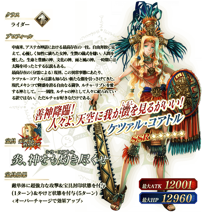 ※上記の「★5(SSR)ケツァル・コアトル」のイラストは霊基再臨第2段階のものです。