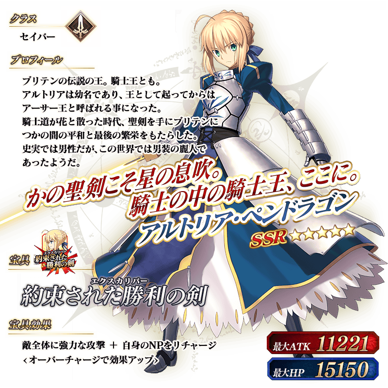 ※上記の「★5(SSR)アルトリア・ペンドラゴン(セイバー)」のイラストは霊基再臨第2段階のものです。