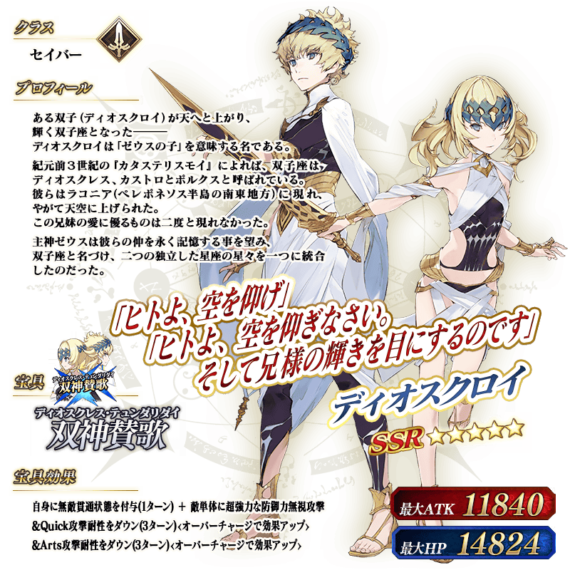 ※上記の「★5(SSR)ディオスクロイ」のイラストは霊基再臨第2段階のものです。