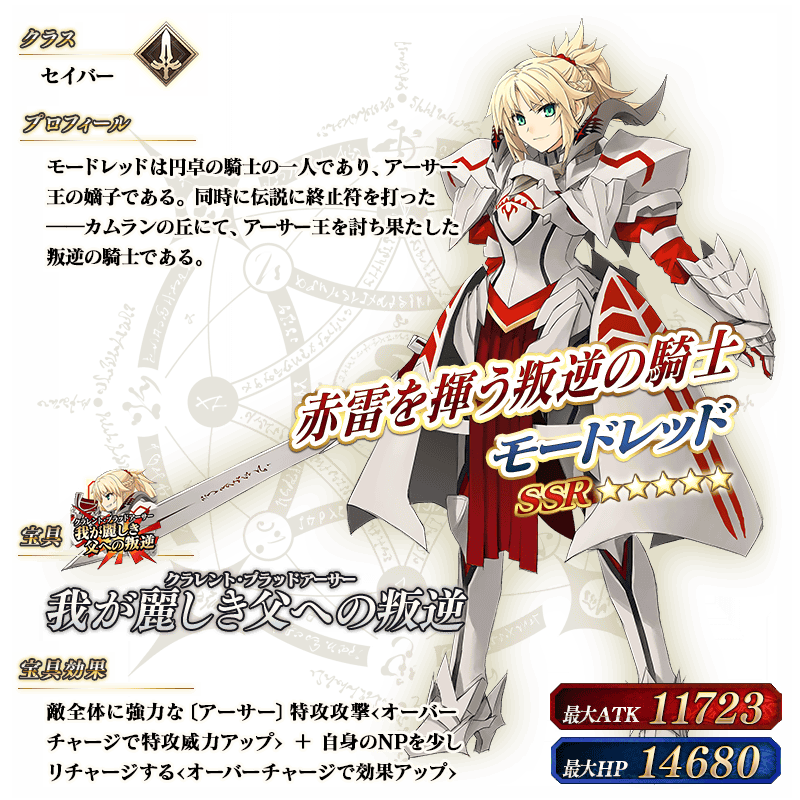 ※上記の「★5(SSR)モードレッド(セイバー)」のイラストは霊基再臨第2段階のものです。