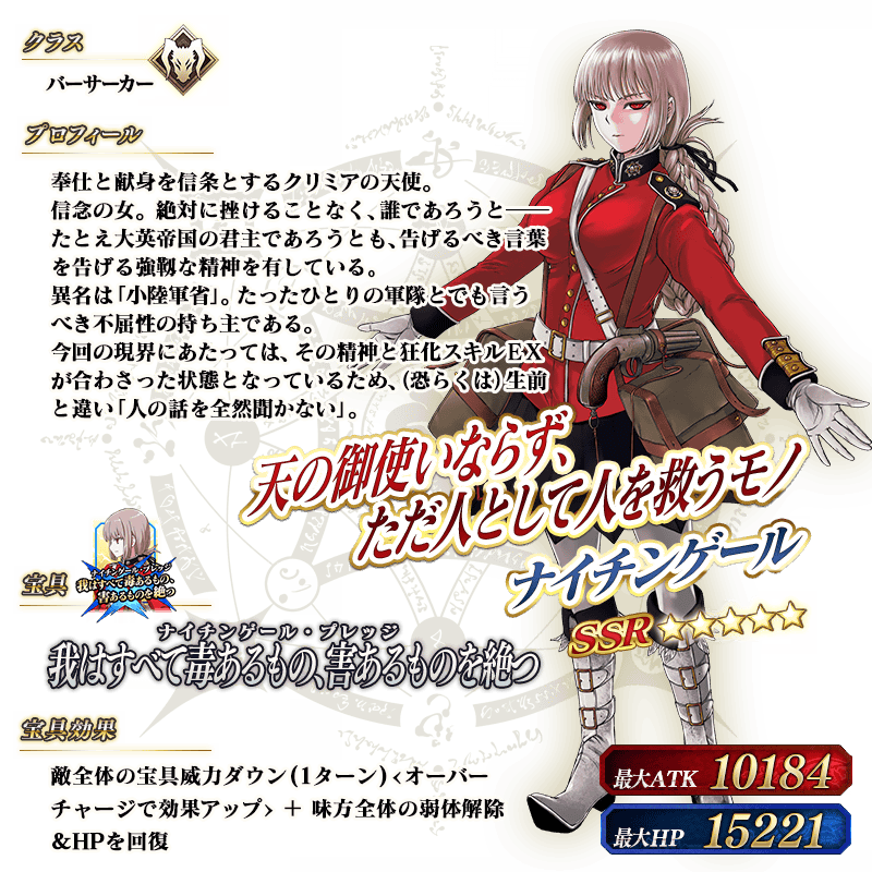 ※上記の「★5(SSR)ナイチンゲール」のイラストは霊基再臨第2段階のものです。