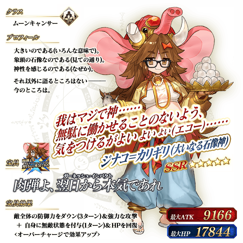 ※上記の「★5(SSR)ジナコ=カリギリ(大いなる石像神)」のイラストは霊基再臨第2段階のものです。