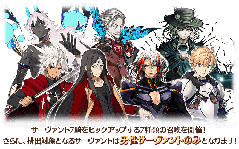 本召喚で排出対象となるサーヴァントは、ピックアップ対象に加えて、ストーリー召喚サーヴァントを含む男性サーヴァントのみが対象となります!