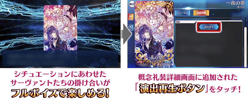 また、概念礼装詳細画面に「演出再生ボタン」が追加され、ボタンをタッチするとその概念礼装を入手した際の初回召喚演出を見返すことができます。
