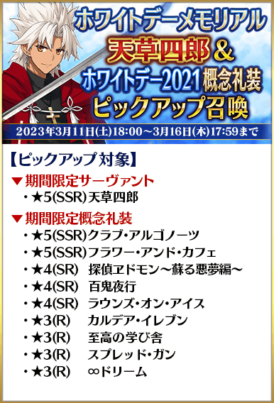 期間限定「ホワイトデーメモリアル 天草四郎&ホワイトデー2021概念礼装ピックアップ召喚」の開催期間中である2023年3月13日(月) 13:00~18:00に一部不具合修正のためのメンテナンスの実施を予定しております。メンテナンス中はゲームのプレイおよび召喚をおこなえませんので、あらかじめご了承ください。