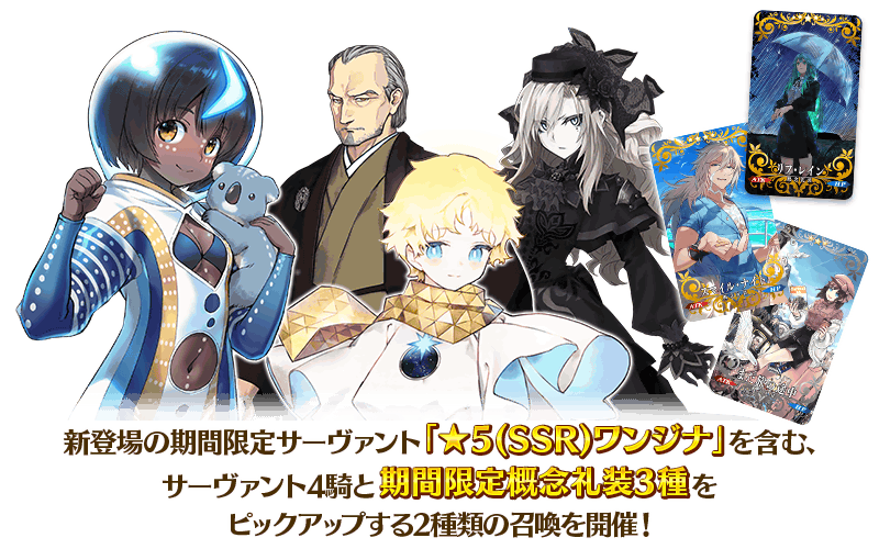 期間限定イベント「ワンジナ・ワールドツアー! ~大精霊と巡る世界一周~」の開幕を記念して、新登場の期間限定サーヴァント「★5(SSR)ワンジナ」を含むサーヴァント4騎と期間限定概念礼装3種をピックアップする2種類の召喚を開催!