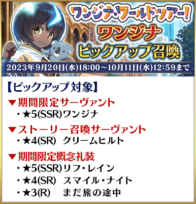 期間限定イベント「ワンジナ・ワールドツアー! ~大精霊と巡る世界一周~」の開幕を記念して、新登場の期間限定サーヴァント「★5(SSR)ワンジナ」を含むサーヴァント4騎と期間限定概念礼装3種をピックアップする2種類の召喚を開催!