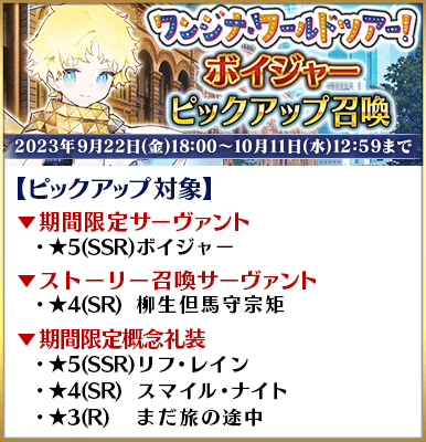 ※下記の期間限定サーヴァントは、ピックアップ対象となっている召喚からのみ排出されます。また、ピックアップ期間終了後、ストーリー召喚には追加されません。
