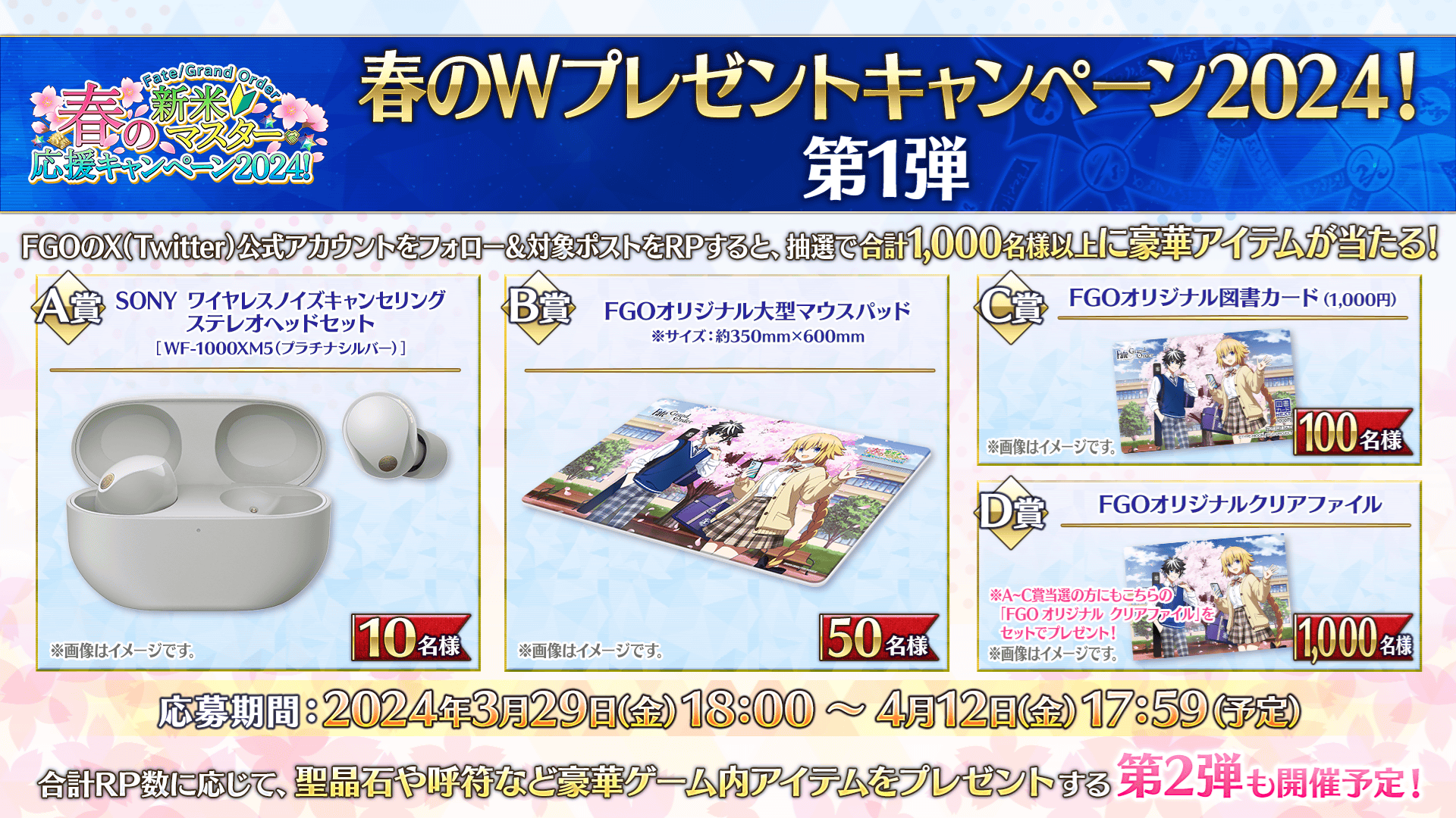 また、Fate/Grand OrderのX(Twitter)公式アカウントをフォロー&リポストしていただいた方を対象に、抽選で合計1,000名様以上に豪華アイテムが当たる「春のWプレゼントキャンペーン2024!」第1弾を実施いたします。
