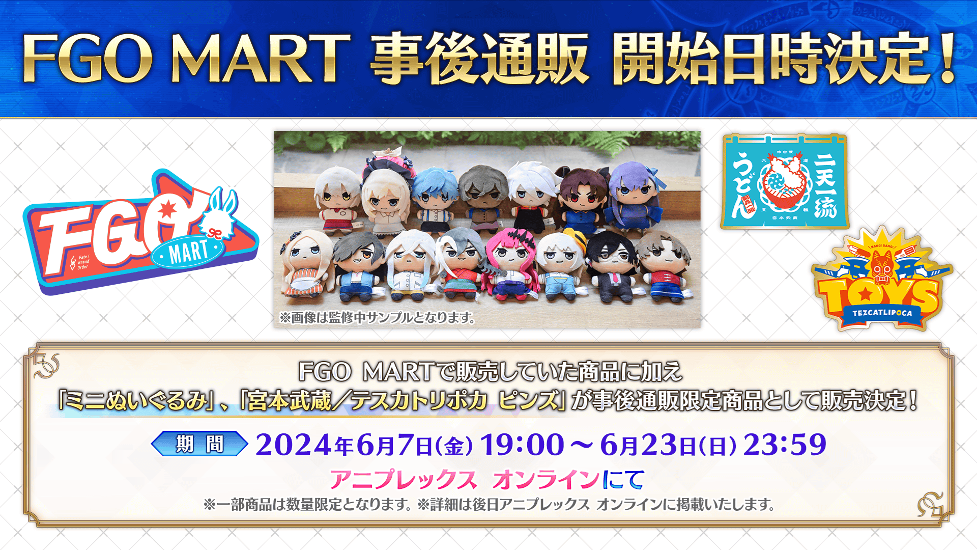 「FGO MART」で販売していた商品に加え「ミニぬいぐるみ」「宮本武蔵/テスカトリポカ ピンズ」を事後物販限定商品として販売いたします。