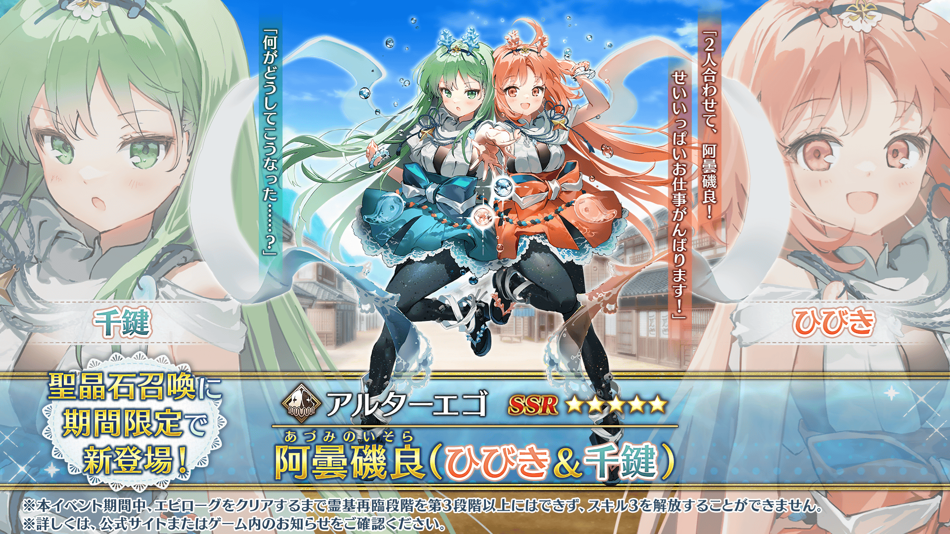 新登場の期間限定サーヴァント「★5(SSR)阿曇磯良(ひびき&千鍵)」と期間限定概念礼装3種をピックアップした聖晶石召喚を開催いたします。
