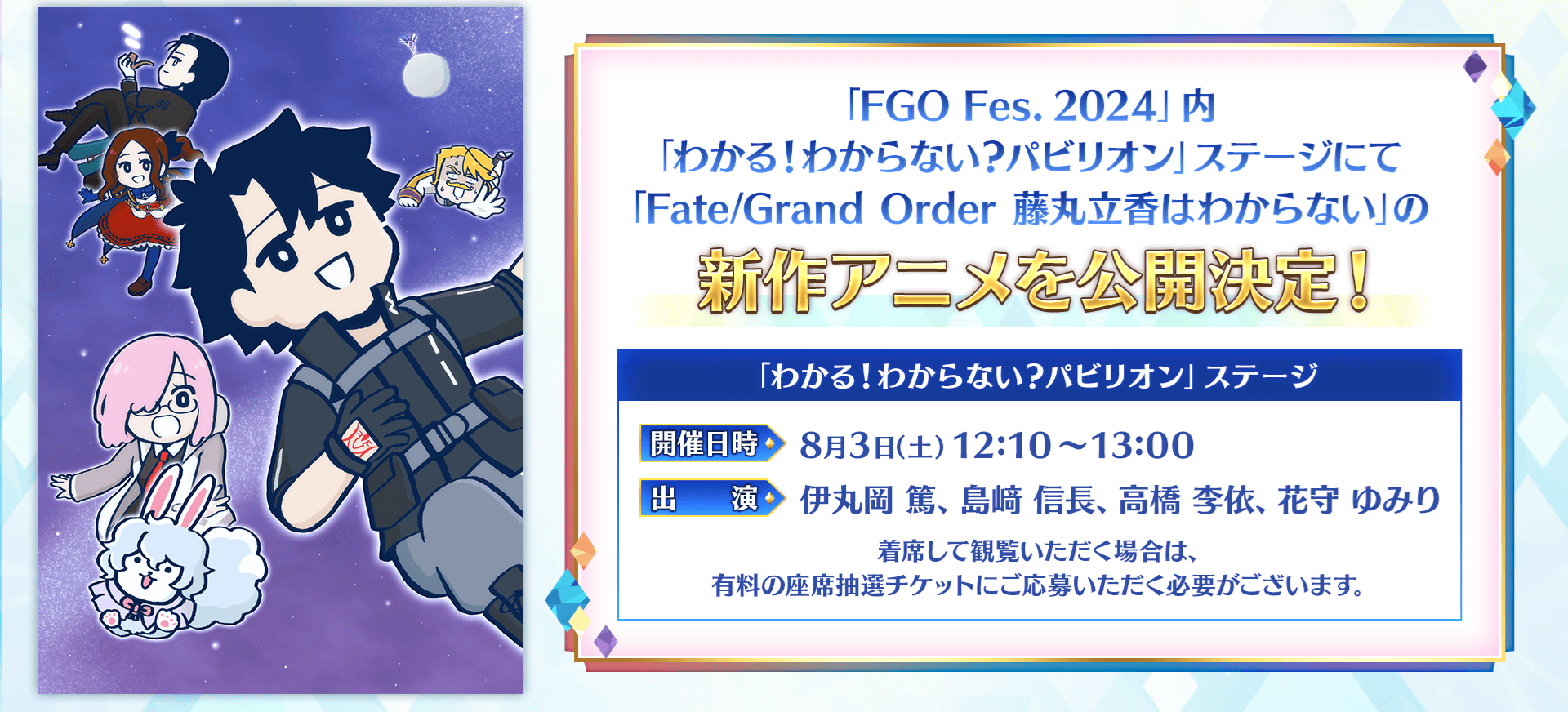 「わかる!わからない?パビリオン」ステージにて「Fate/Grand Order 藤丸立香はわからない」の新作アニメを公開することが決定いたしました。