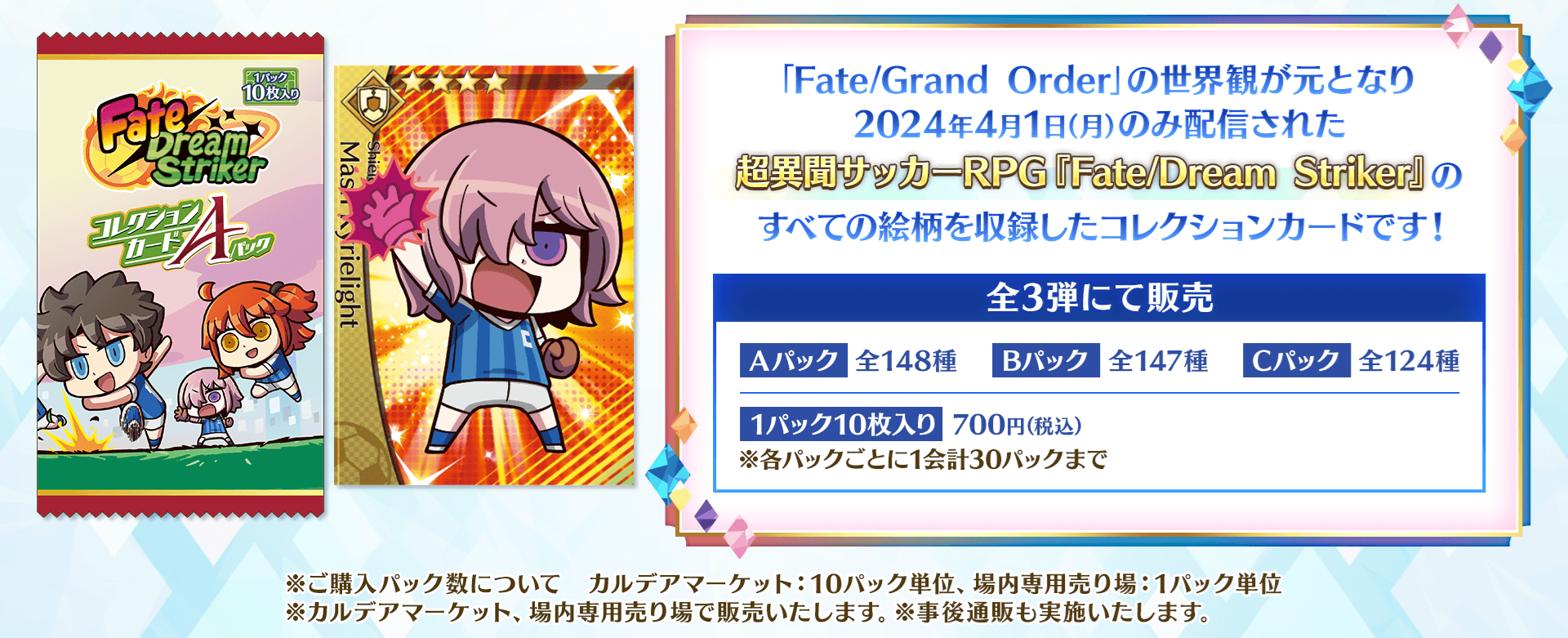 「Fate/Grand Order」の世界観が元となり2024年4月1日(月)のみ配信された超異聞サッカーRPG「Fate/Dream Striker」のすべての絵柄を収録したコレクションカードを販売いたします。