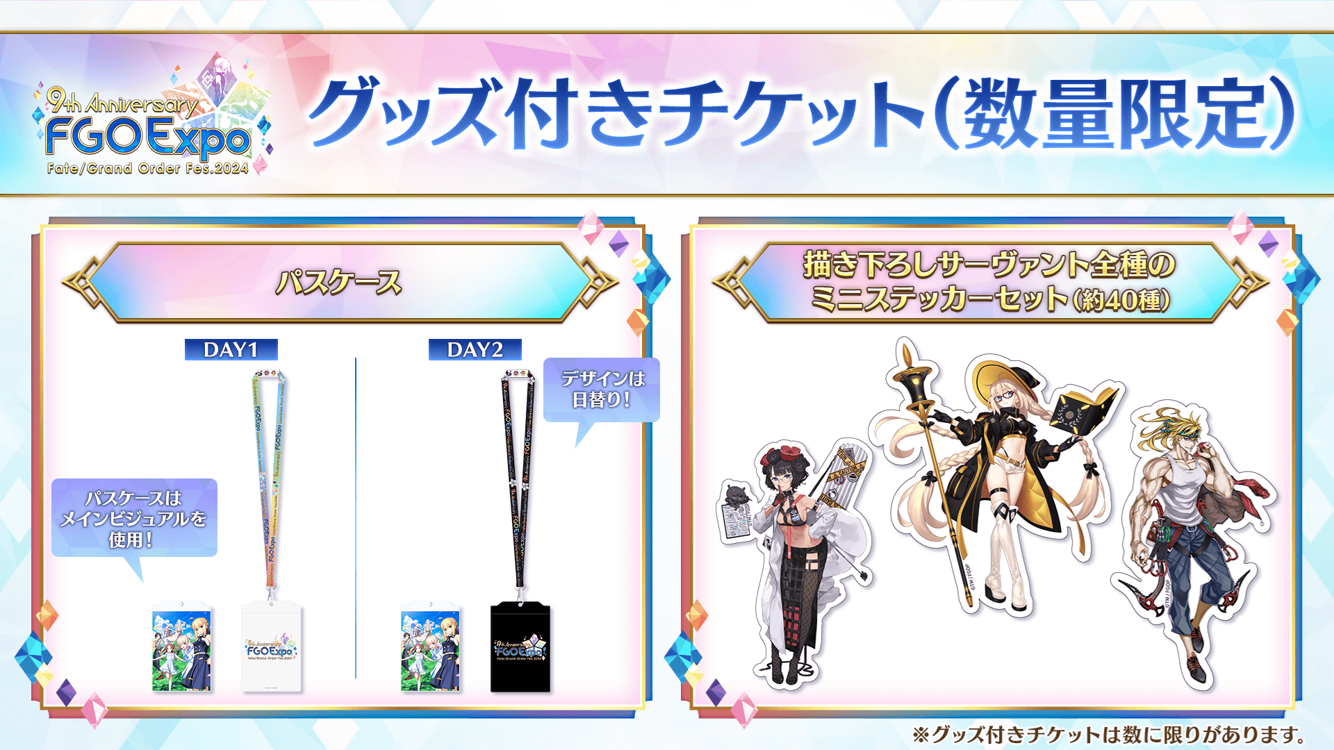 グッズ付きチケットのグッズは、パスケースおよび描き下ろしサーヴァント全種のミニステッカーセット(約40種)となります。