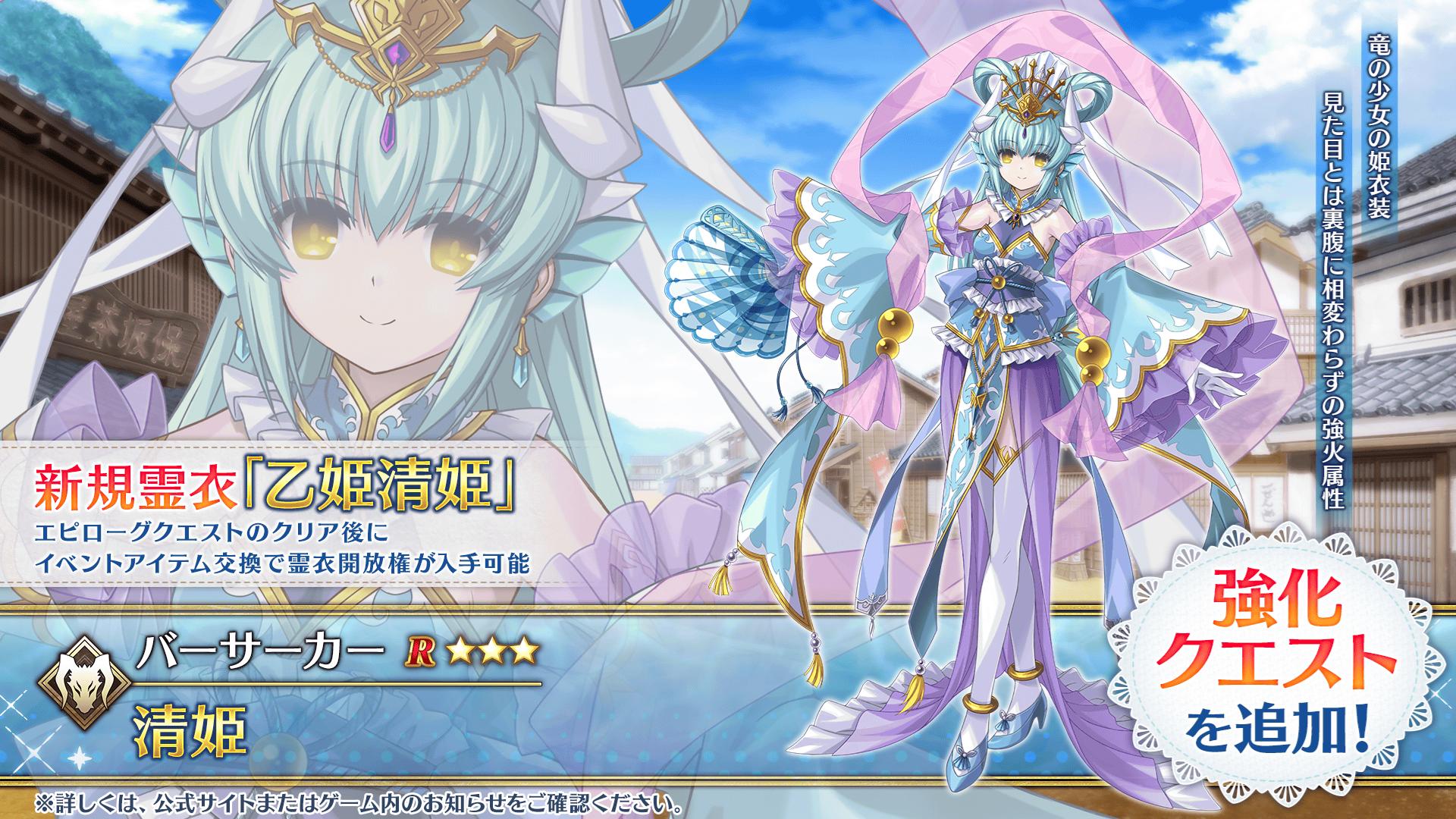 期間限定イベント「踊るドラゴン・キャッスル! ~深海の姫君とふたつの宝玉~」の報酬として、「★3(R)清姫(バーサーカー)」の霊衣「乙姫清姫」の開放権が登場!