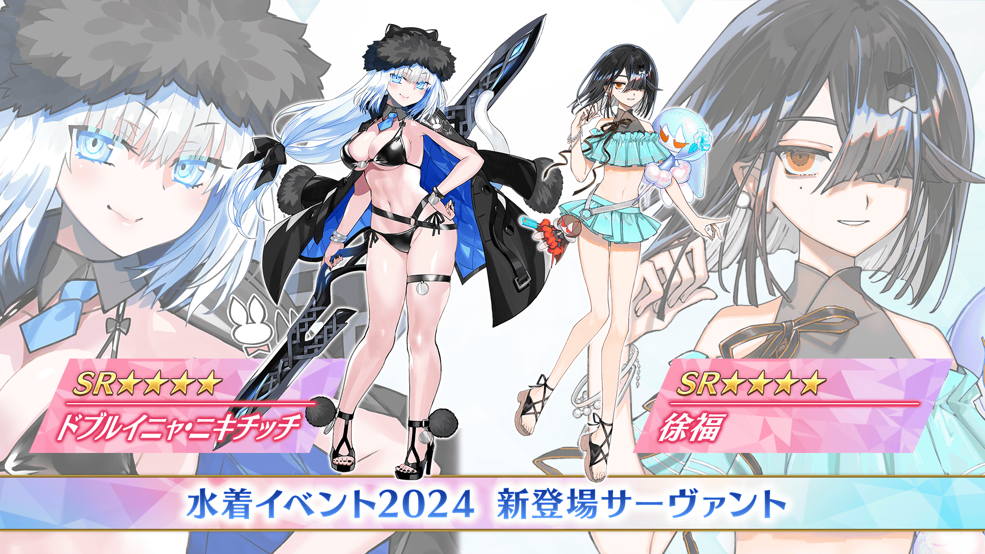 8月14日(水)開幕予定の期間限定「水着イベント2024」に登場する「★5(SSR)シエル」「★4(SR)ドブルイニャ・ニキチッチ」「★4(SR)徐福」を発表いたしました。