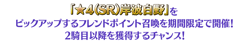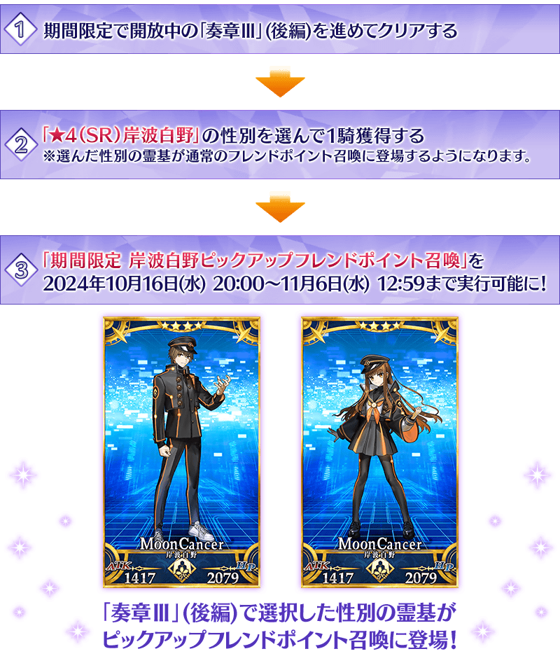 本召喚における「★4(SR)岸波白野」の召喚確率は、通常のフレンドポイント召喚の3倍となっております。 ※「奏章Ⅲ」(後編)で選択した性別の霊基のみ登場いたします。 ※「★4(SR)岸波白野」以外の★4(SR)サーヴァントは登場いたしません。
