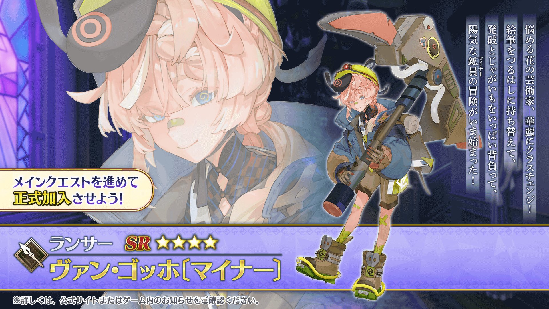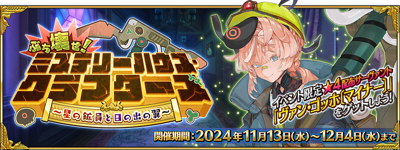 期間限定イベント「ぶち壊せ! ミステリーハウス・クラフターズ ~星の鉱員と日の出の翼~」のメインクエストを進めることで、イベント限定の配布サーヴァント「★4(SR)ヴァン・ゴッホ〔マイナー〕」を正式加入させることができます。
