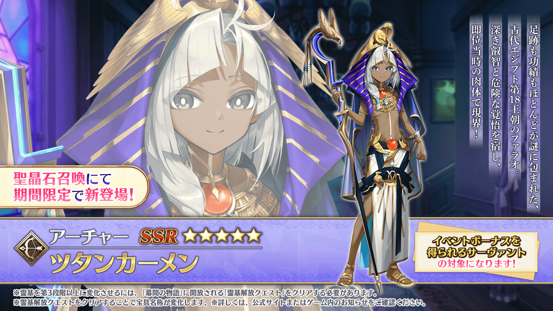 新登場の期間限定サーヴァント「★5(SSR)ツタンカーメン」と期間限定概念礼装3種をピックアップした聖晶石召喚を開催いたします。