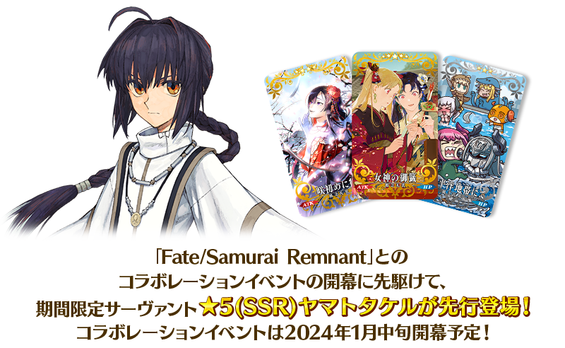「Fate/Samurai Remnant」とのコラボレーションイベントの開幕に先駆けて、期間限定サーヴァント「★5(SSR)ヤマトタケル」が先行で登場いたします。