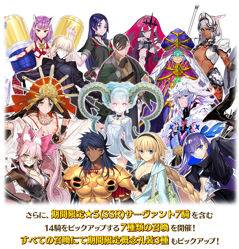 さらに今回は、期間限定★5(SSR)サーヴァント7騎を含む14騎と期間限定概念礼装をピックアップする7種類の召喚を期間毎に切り替わりで開催いたします。