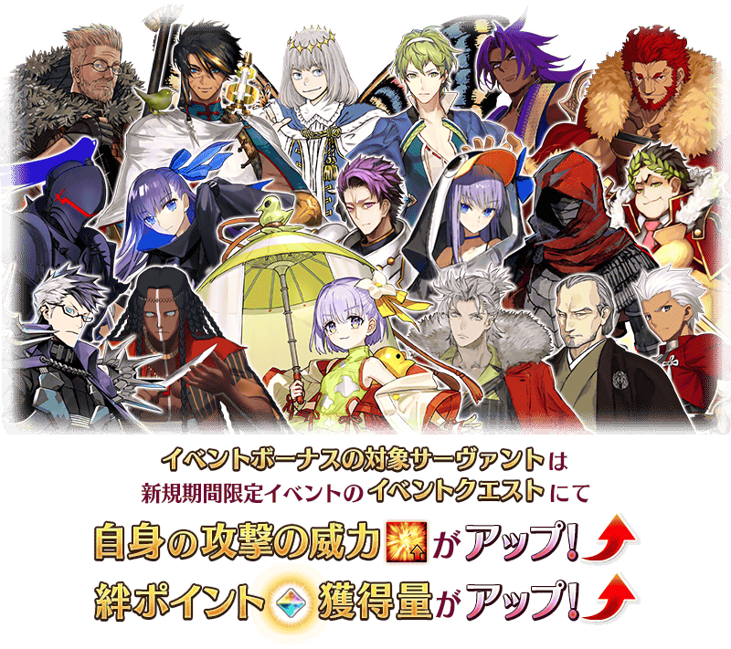 新規期間限定イベントの期間中、一部のサーヴァントはイベントクエストにおける「自身の攻撃の威力がアップ」と「絆ポイント獲得量がアップ」のボーナスを得られます!