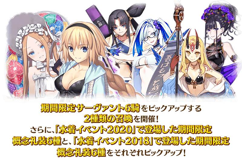 2024年8月中旬を予定している「水着イベント2024」の開幕決定を記念して、期間限定サーヴァント6騎をピックアップする2種類の召喚を開催いたします!