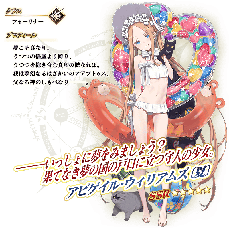 ※上記の「★5(SSR)アビゲイル・ウィリアムズ〔夏〕」のイラストとセイントグラフは霊基再臨第3段階のものです。