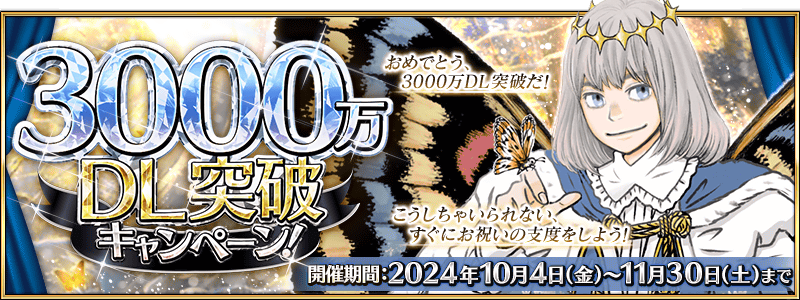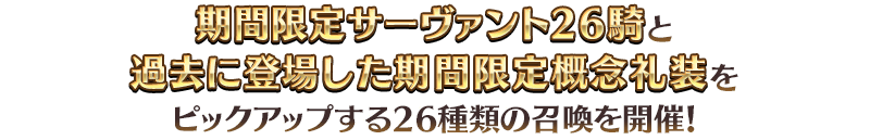 3000万DL突破を記念して、期間限定サーヴァント26騎と過去に登場した期間限定概念礼装をピックアップする26種類の召喚を開催いたします!