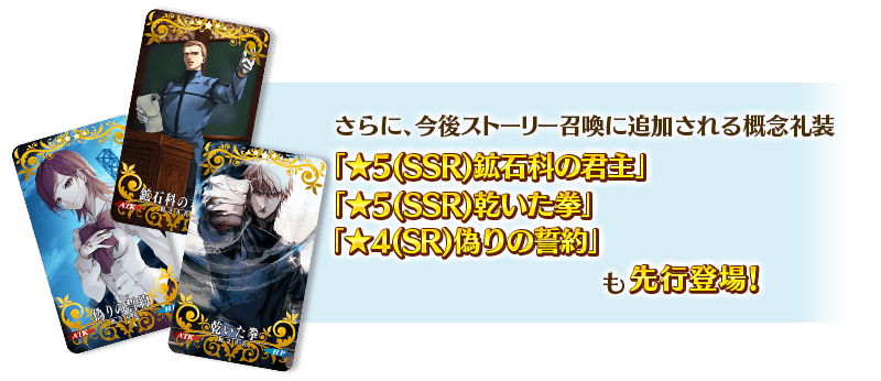 さらに、今後ストーリー召喚に追加される概念礼装3種が先行登場するほか、★4(SR)概念礼装のラインナップを一部リニューアルいたします!