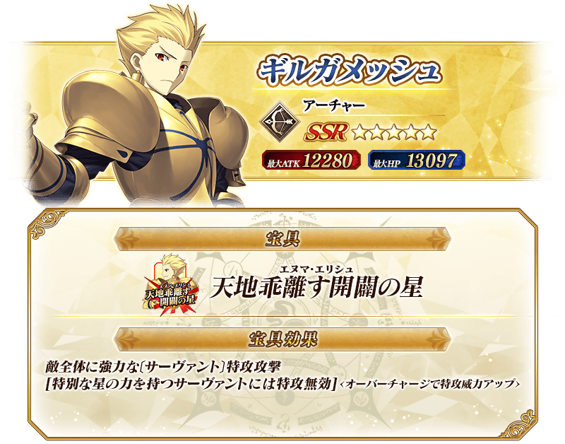※上記の「★5(SSR)ギルガメッシュ(アーチャー)」のイラストは霊基再臨第2段階のものです。
