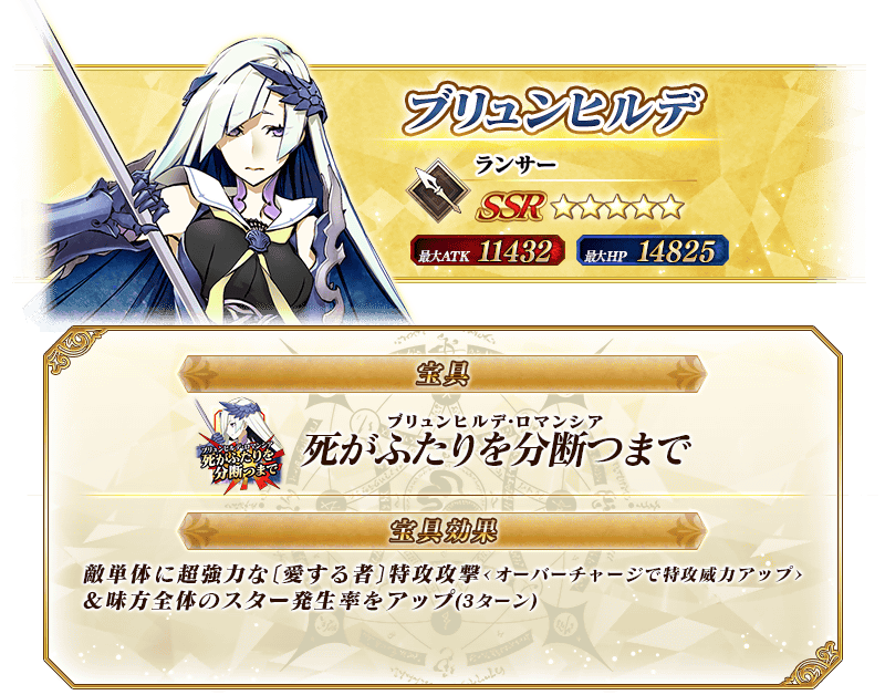 ※上記の「★5(SSR)ブリュンヒルデ(ランサー)」のイラストは霊基再臨第2段階のものです。