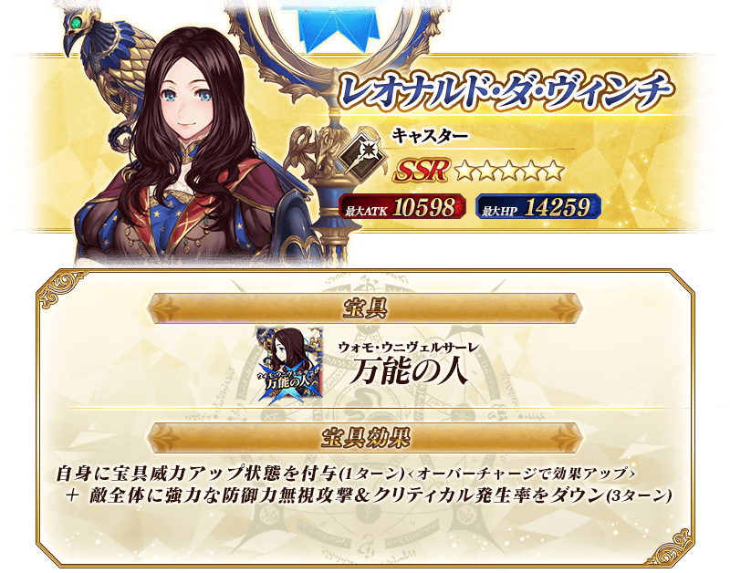 ※上記の「★5(SSR)レオナルド・ダ・ヴィンチ(キャスター)」のイラストは霊基再臨第2段階のものです。