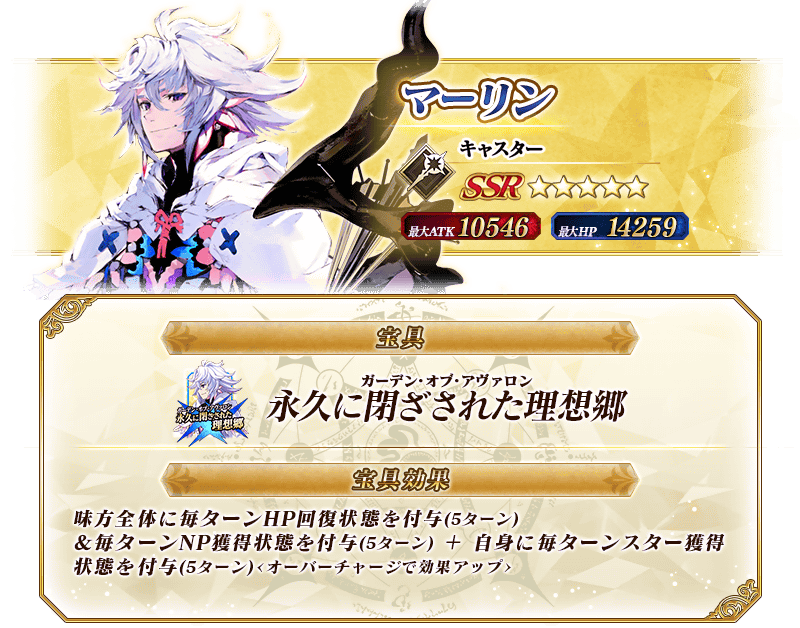 ※上記の「★5(SSR)マーリン」のイラストは霊基再臨第2段階のものです。 ※第七特異点にてゲストサーヴァントとして登場した際とは、一部宝具効果が異なります。