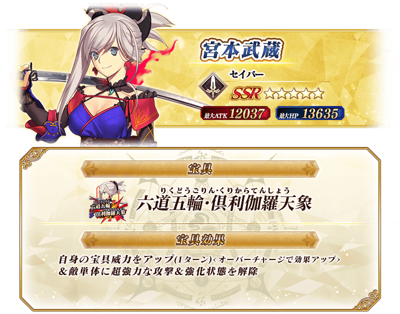 ※上記の「★5(SSR)宮本武蔵(セイバー)」のイラストは霊基再臨第2段階のものです。