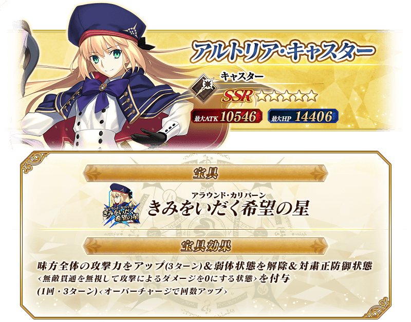 ※上記の「★5(SSR)アルトリア・キャスター(キャスター)」のイラストは霊基再臨第2段階のものです。