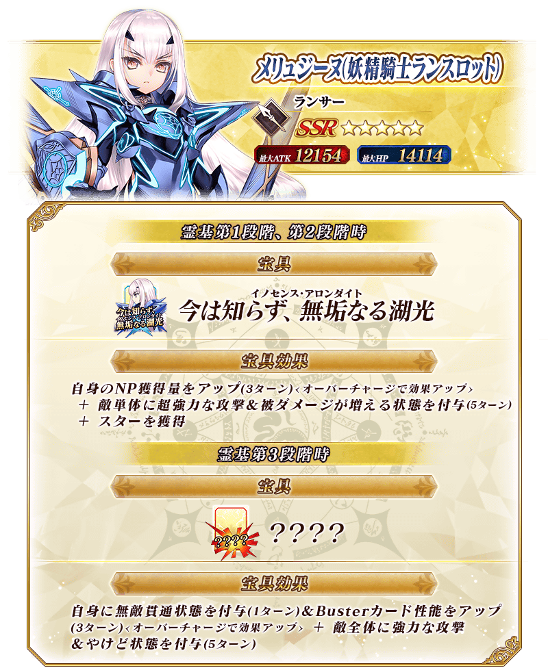 ※「★5(SSR)メリュジーヌ(ランサー)(妖精騎士ランスロット)」は、「★5(SSR)妖精騎士ランスロット」を霊基再臨第2段階にすることで名称が「★5(SSR)メリュジーヌ」に変化します。
