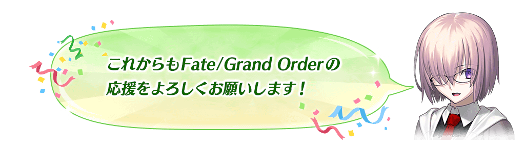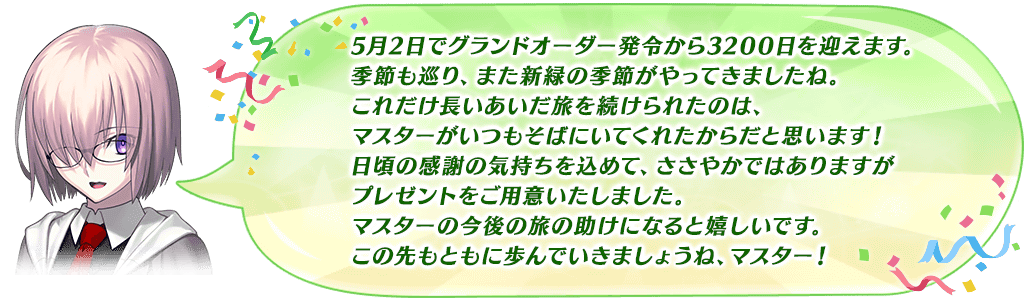 ※限定ログインボーナスの受け取りには5月1日(水) 23:59までに「特異点F 炎上汚染都市 冬木」をクリアしている必要がありますのでご注意ください。 ※上記時間までに、ターミナル画面にあるクエストボードに「CLEAR」の文字が表示されている必要があります。 ※期間内にログインできなかった場合には受け取ることができません。 ※プレゼントは、1回のみの受け取りになります。