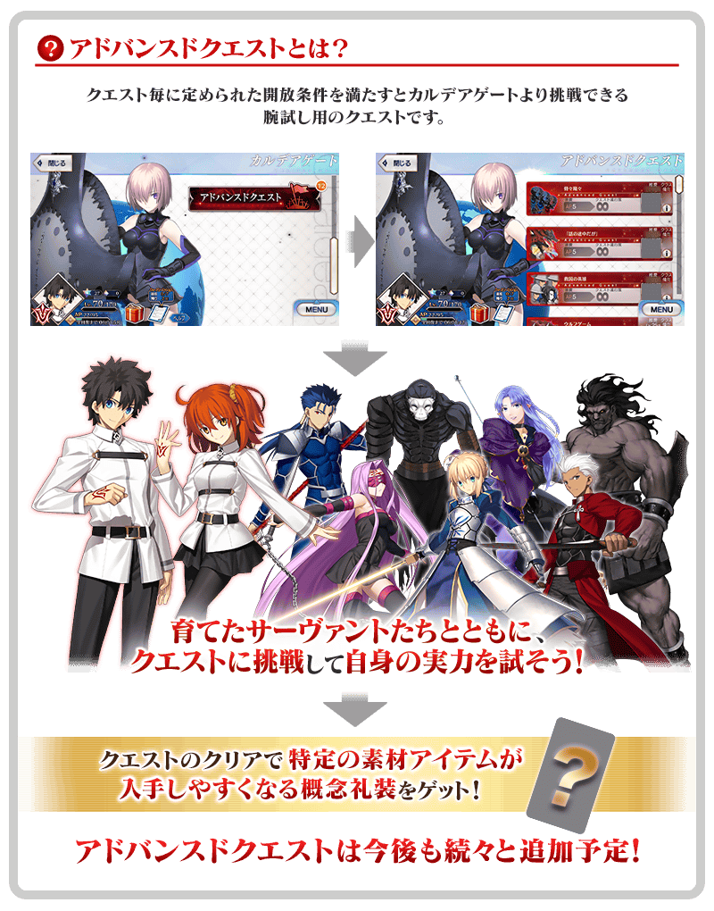 サーヴァントの育成に役立ちますので、ぜひアドバンスドクエストをクリアして各概念礼装を獲得してみてください!
