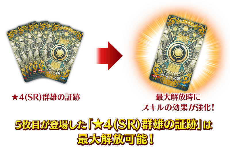 5枚目が登場した「★4(SR)群雄の証跡」は、最大解放することでスキルの効果を強化することができます。