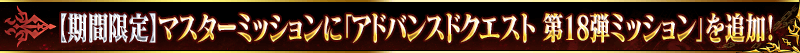 下記の期間中、「マスターミッション」の「限定」タブ内に期間限定で「アドバンスドクエスト 第18弾ミッション」が追加されます。