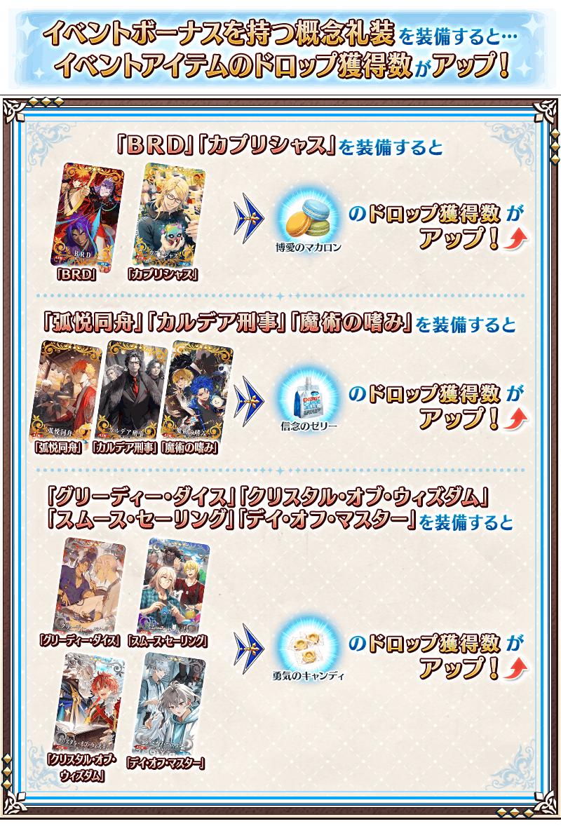 本イベントと同時開催の聖晶石召喚にてピックアップされる期間限定概念礼装を装備することで、イベントアイテム「博愛のマカロン」「信念のゼリー」「勇気のキャンディ」それぞれのドロップ獲得数がアップします。