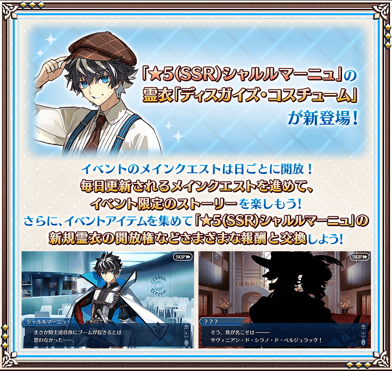 期間限定イベント「CBC2024 シャルルマーニュのモンジョワ・騎士道!」の報酬として、「★5(SSR)シャルルマーニュ」の霊衣「ディスガイズ・コスチューム」の開放権が登場!