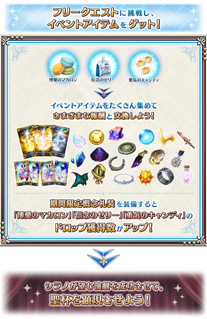 ※「★5(SSR)シャルルマーニュ」の霊衣開放権は、特定のメインクエストをクリア後に交換可能になります。 ※伝承結晶、英霊結晶・流星のフォウくんALL★4(HP)、英霊結晶・日輪のフォウくんALL★4(ATK)については、後日開放される本イベントのメインクエストをクリア後に交換可能になります。 ※イベントアイテム交換期間終了後「博愛のマカロン」「信念のゼリー」「勇気のキャンディ」は消滅します。