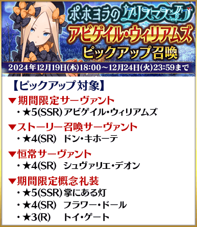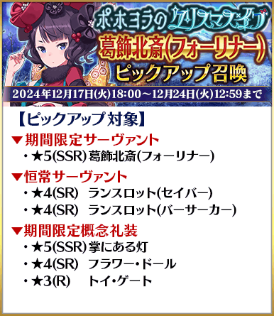 本召喚の開催期間中である2024年12月23日(月) 13:00~18:00までの期間、メンテナンスの実施を予定しております。